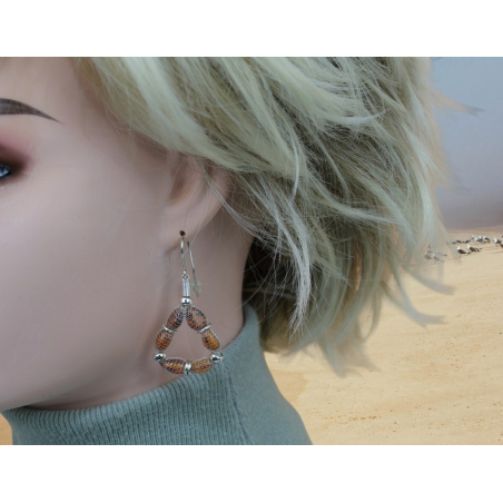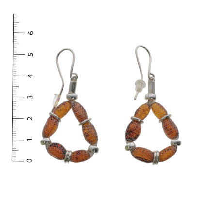 Kolczyki srebro z bursztynem . Kawałki bursztynu są umieszczone w srebrnej pończoszce. Zausznice są zabezpieczone przed zagubieniem  silikonowymi kapturkami.