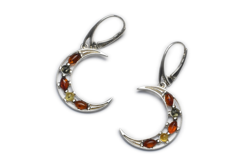 Kolczyki srebrno bursztynowe. Cudowne księżyce na słoneczne dni.