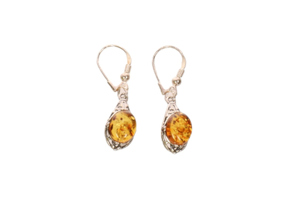 Kolczyki srebrno bursztynowe. Stara prawda głosi . Jeśli nie chcesz mojej zguby to bursztynka kup mi luby.