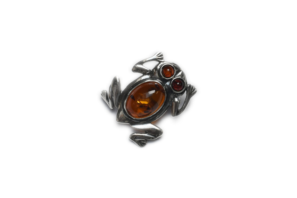 Broszka srebrno bursztynowa żaba. Żaba symbolizuje bogactwo transformację i odnowę.